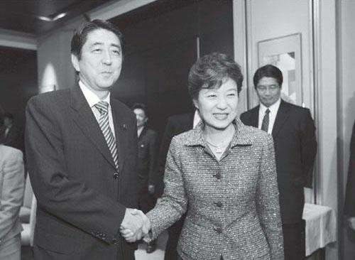 2.韩日关系的重点在于必须持续敞开真心对话。与日本安倍晋三合影。